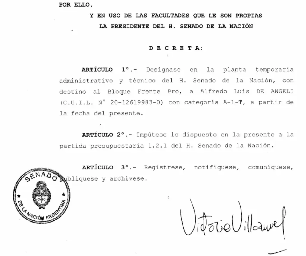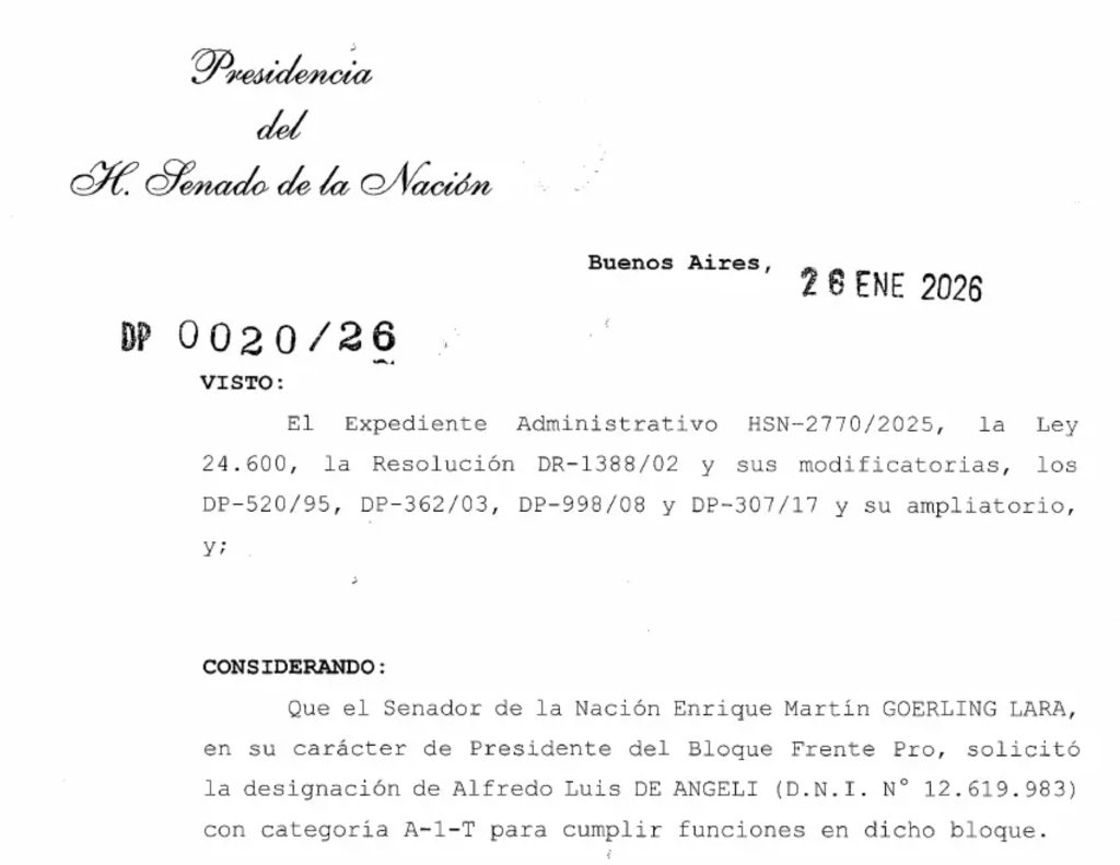 La discusión sobre la “casta política” y la perpetuidad en cargos del Estado sumó un nuevo capítulo en el Senado. El exsenador nacional Alfredo De Ángeli, cuyo mandato finalizó en diciembre, fue designado como asesor del bloque PRO en la Cámara Alta bajo la modalidad de planta transitoria, en la categoría más alta del escalafón. El decreto de nombramiento se formalizó el 26 de enero y lleva la firma de la vicepresidenta Victoria Villarruel, en su carácter de titular del Senado. La solicitud fue impulsada por el jefe del bloque PRO, Martín Göerling, quien sucedió a De Ángeli en la conducción de la bancada amarilla.